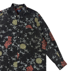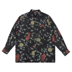 ヴィンテージの着物をほどき、一着ずつ丁寧に仕立てた長袖シャツ。落ち着きのある柄に、貝ボタンの上品な光沢を添えることで、さりげなく洗練された印象に仕上げました。